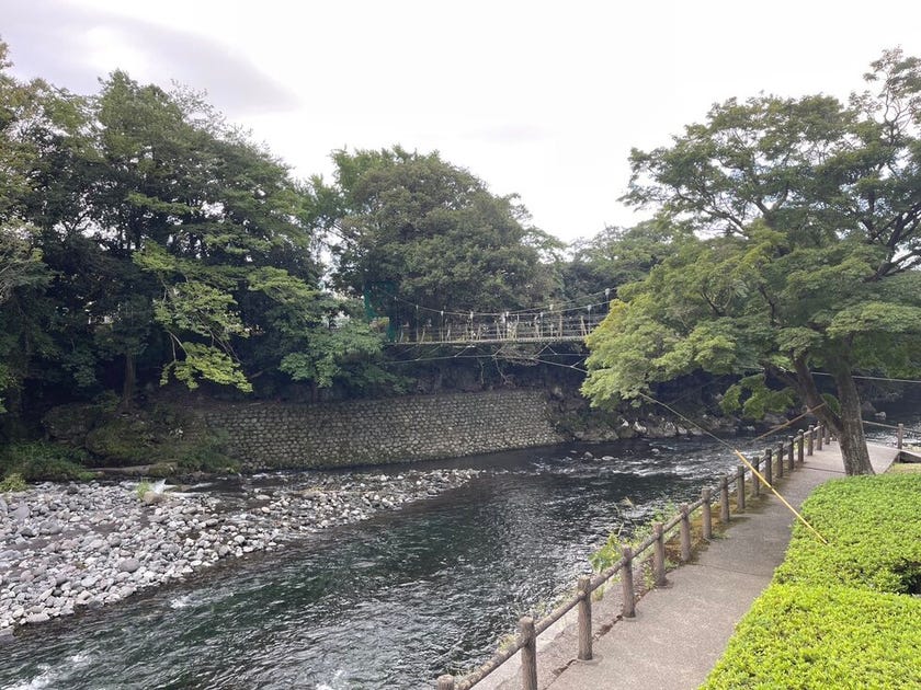 こちらが吊り橋の写真です。吊り橋は滝の近くにあり、渡る際には下に流れる川が見えます。ここからの眺めは最高で、滝の絶景を楽しむには欠かせないスポットです。